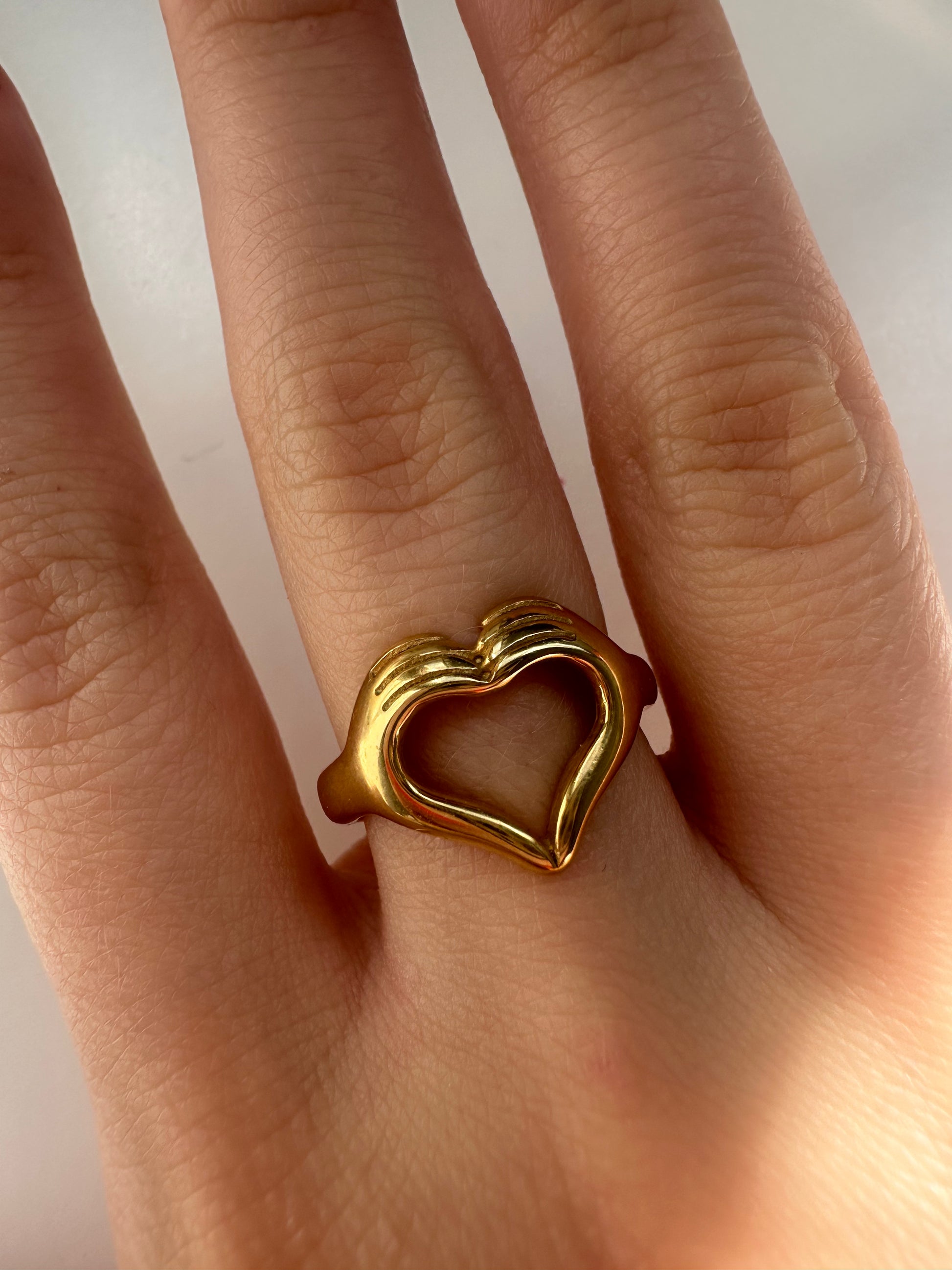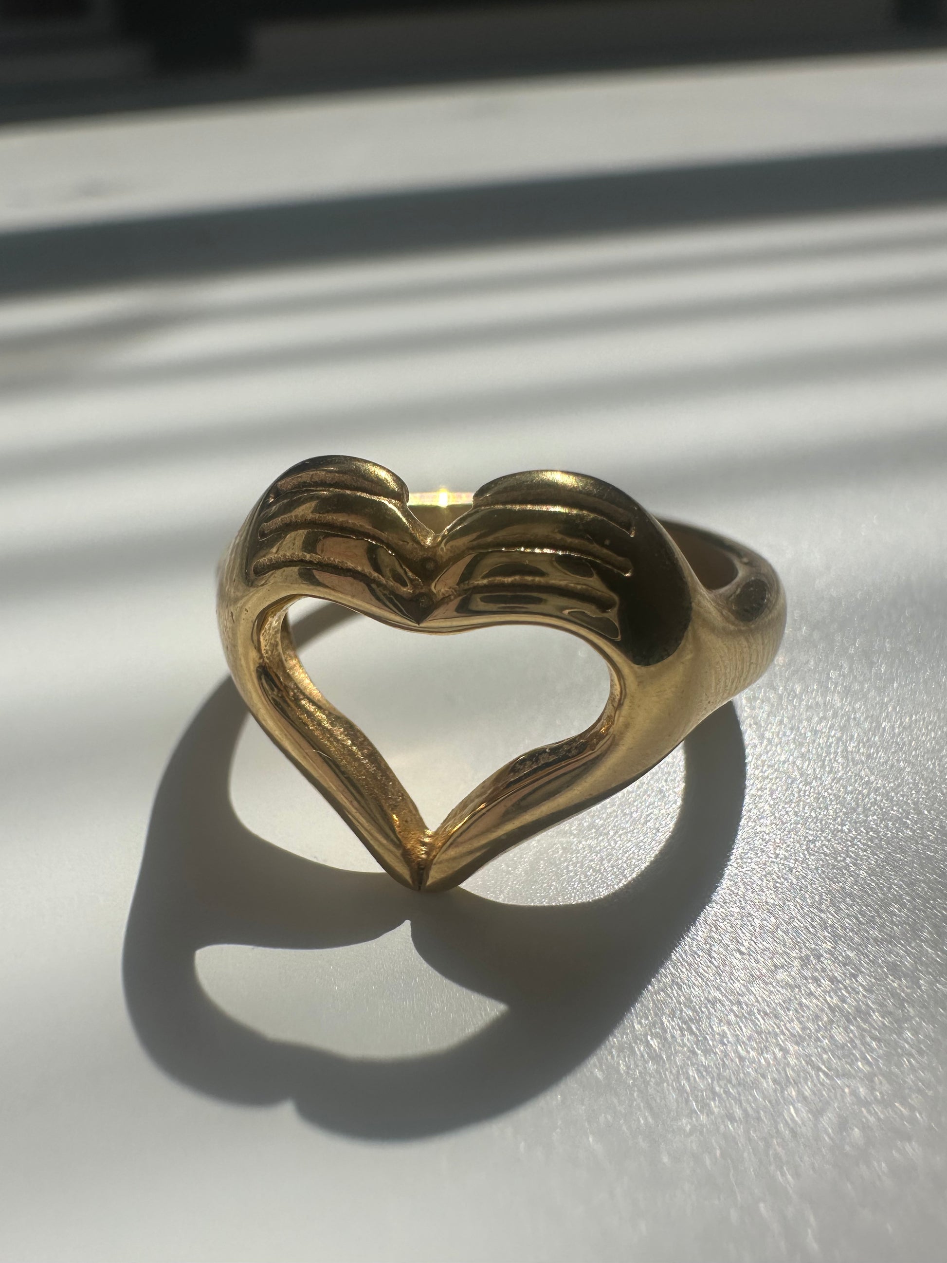 Get ready to dazzle with our gold Heart Hand Ring! It's the perfect addition to your jewelry collection, easily mixing and matching with any outfit and mood. Crafted from durable stainless steel and gold plated, this ring adds a dash of fun to your look. Slip it on, show off your style, and let the good vibes flow!